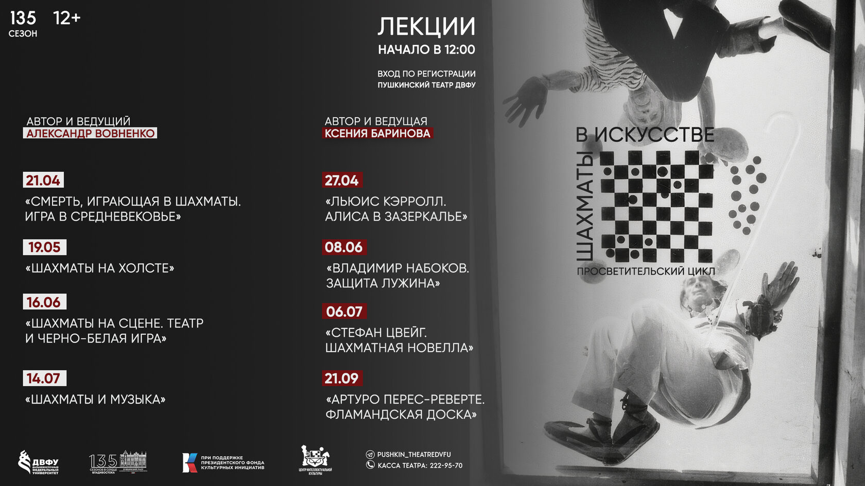 Просветительский цикл «Шахматы в искусстве» запускает Центр интеллектуальной культуры в содружестве с Пушкинским театром ДВФУ с апреля по сентябрь 2024 года. Участников ждут 8 лекций о символическом значении шахмат в различных произведениях искусства. Так, литературовед Ксения Баринова расскажет о шахматах в шедеврах Набокова, Цвейга, Кэрролла. А директор Пушкинского театра Александр Вовненко представит многообразие интерпретаций игры в живописи и кинематографе. Кульминаций проекта станет концерт струнного квартета Ameci, на котором прозвучат мелодии различных композиторов, посвящённые шахматной теме.